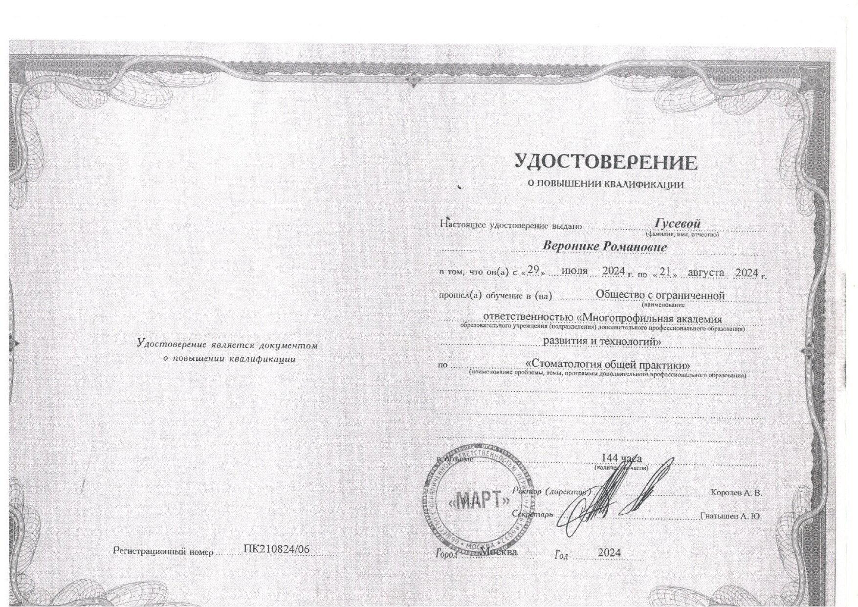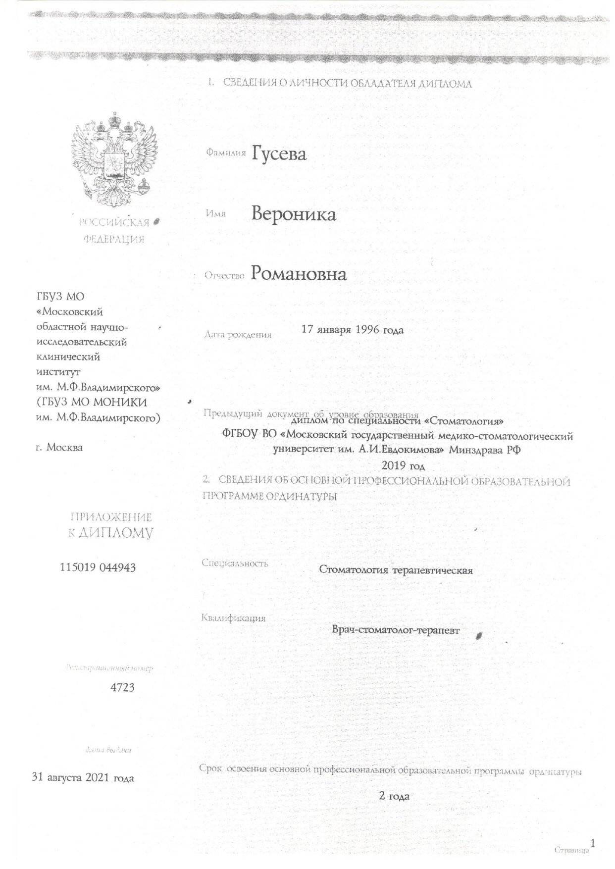 2019-2021 гг. – МОНИКИ им. М.Ф.Владимирского терапевтическая стоматология.